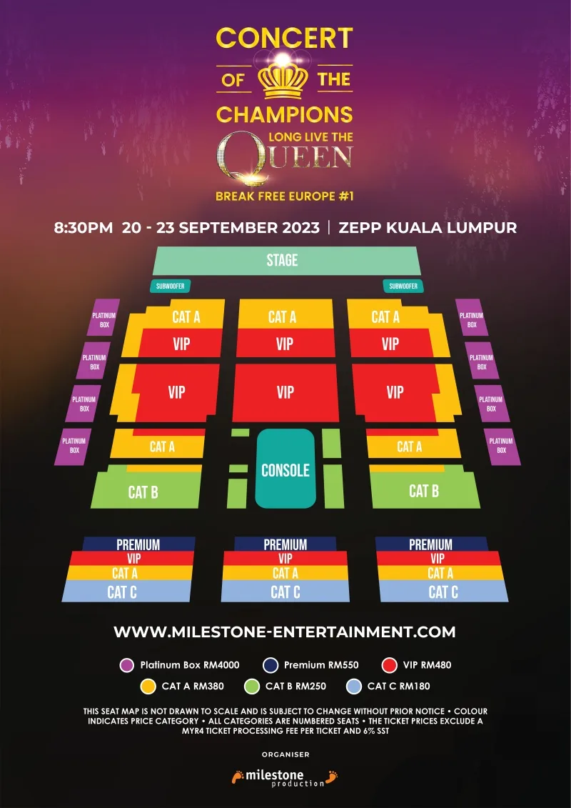 Ticketing: RM4000 (Platinum – 6 pax), RM550 (Premium), RM480 (VIP), RM380 (CAT A), RM250 (CAT B), RM180 (CAT C). Early Bird discount: Up to 25% Discount on Premium Seats, VIP Seats, CAT A, and CAT B from now till 18th June.