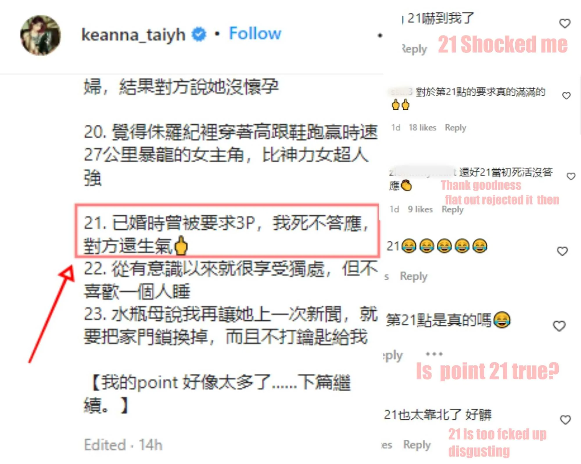 Earlier this week on Monday (6th June), the public figure posted on her Instagram where she revealed some fun facts “about me that might surprise you (关于我可能让你很意外的point)”. Her “surprising points” include being a natural blonde at birth and drinking coffee at the age of 6. The most shocking reveal? “During my married life, I was asked to have a threesome. But I flat out rejected it.”