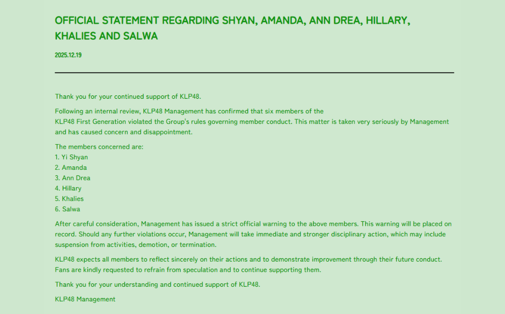 In response, KLP48 Management confirmed that an internal review had been conducted and that the members involved were found to have violated the group’s rules on member conduct. “This matter is taken very seriously by Management and has caused concern and disappointment,” the company stated.