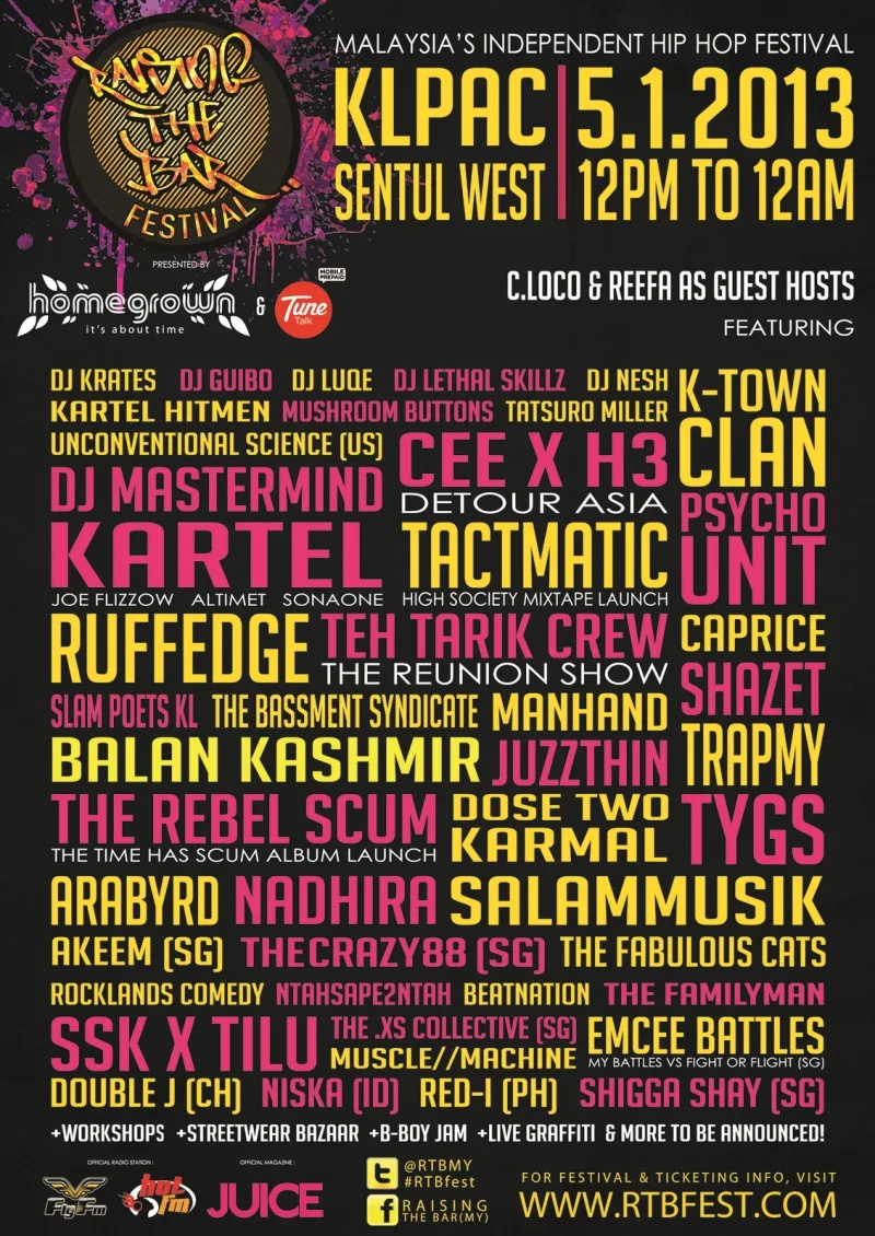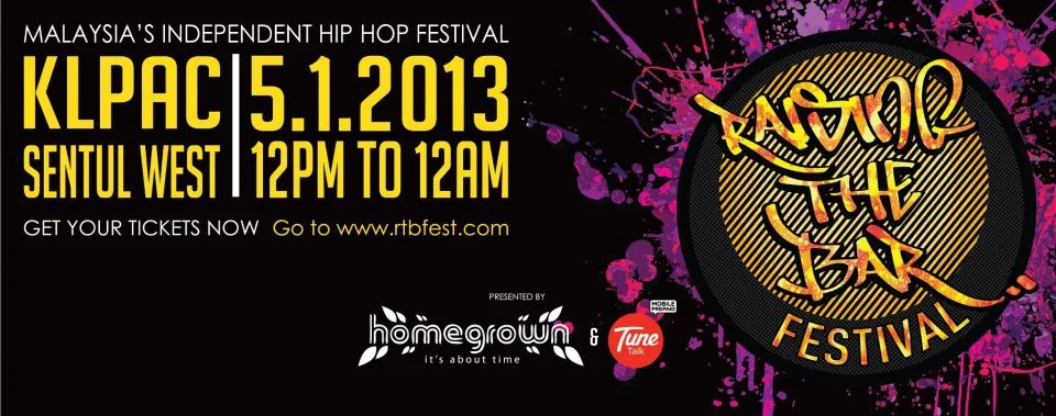 “Raising The Bar Festival 2013” is all about championing independent hip hop in Malaysia. Organized by Raising The Bar and presented by Homegrown Productions and Tune Talk, the festival brings together not only the ever-growing local hip hop community together but also festival-savvy and music fans alike.