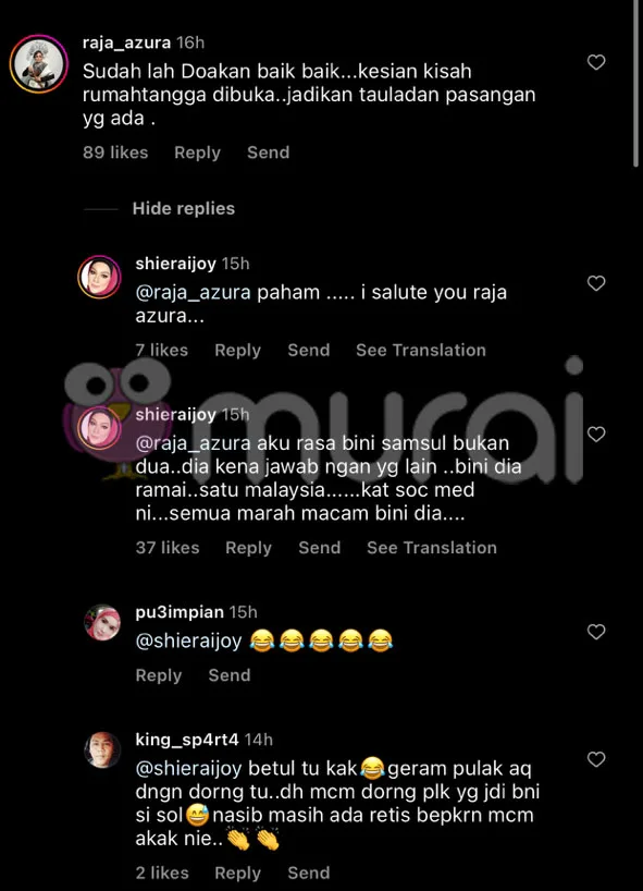 “Understood. I respect you, Raja Azura,” the Suria fm announcer replied to the comment. She then added, “I think Syamsul’s not married to two wives, he has to answer with several others as well. He has a lot of wives, throughout the entire nation. Everyone on social media is enraged, just like his wife.”