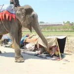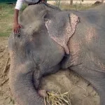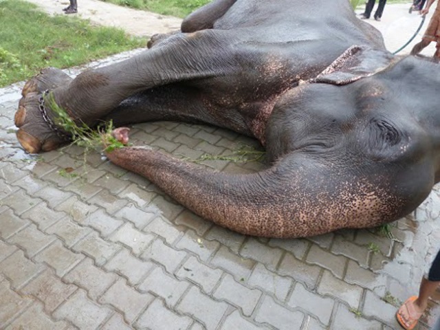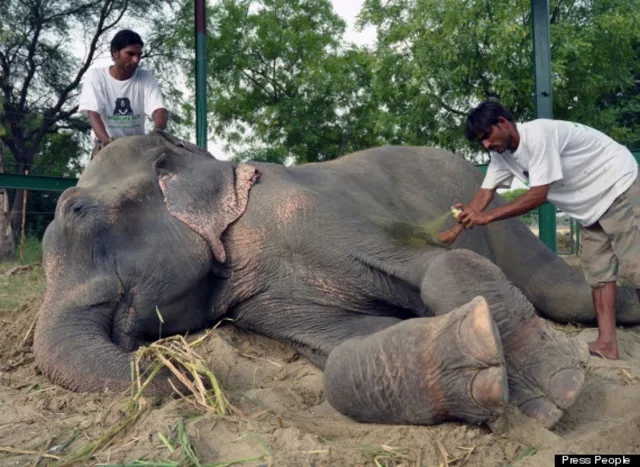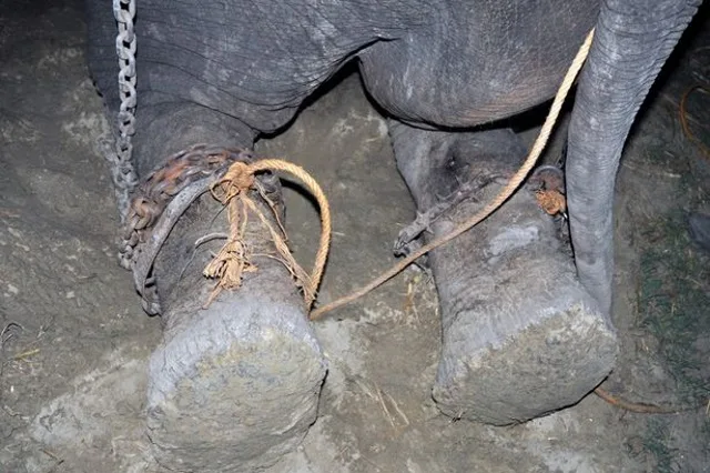 Believed to have been snatched from his mom as a young calf, Raju the elephant is thought to have had 27 owners and was being used as a beggars’ “prop” in Allahabad from dawn until dusk. For 5 decades, he was heartlessly abused, held shackled in spiked chains, and forced to live off plastic and paper scraps from passing tourists. Because his legs were bound in spiked chains, it made walking difficult and left him with chronic wounds.