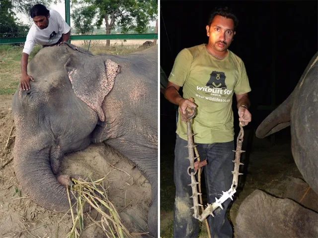 The team had to go in with fruits and speak softly to Raju to reassure him that they were there to help. As tears rolled down Raju’s face, Wildlife SOS’ head veterinarian Dr. Yaduraj Khadpekar removed the spiked chains from Raju’s feet. It took him and two handlers 45 minutes to liberate him as they’d been wound round his legs to prevent their removal and to cause pain if anyone tried to take them off.
