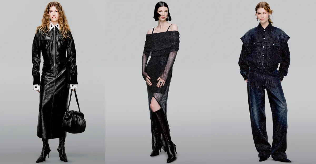 From Day to Night: Daylight beckons with a tailored black maxi coat, cinched at the waist, teasing a hint of feminine allure that lingers eternally. A white shirt, crisp as a new chapter, flaunts an oversized bow – a statement that speaks volumes without uttering a word. As the sun retreats, evening ensembles emerge, casting their spell with low-slung jeans adorned in champagne-hued rhinestones, dancing in harmony with a coordinating jacket. A black A-line mini dress makes its entrance, crowned with a razor-sharp white collar.