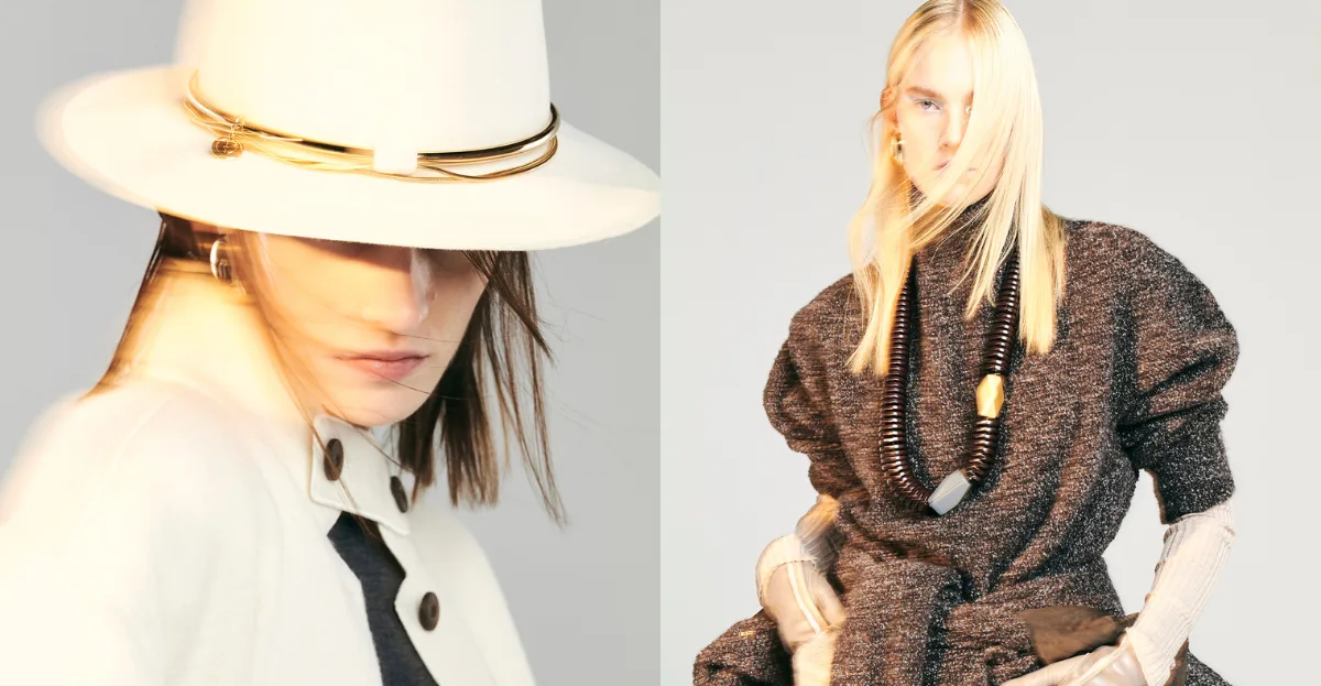 The color palette unfolds like a poetic journey through warm neutrals – champagne, beige, hazelnut – before dipping into hints of navy blue and black. This aura of elegance extends to accessories, where close-fitting boots, flat shoes, and slender heels adorned with metal detailing grace the stage. Small bags with metal straps, clutches, and handbags complete this symphony of style.
