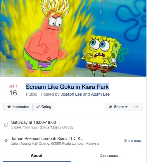 In case you’re wondering if any of the aforementioned events are legit, there is already evidence of TARUC students attempting to splash like the water Pokemon, Magikarp. Lol! Earlier this month on 3rd September, a bunch of people in Washington actually showed up to “scream like Goku”.