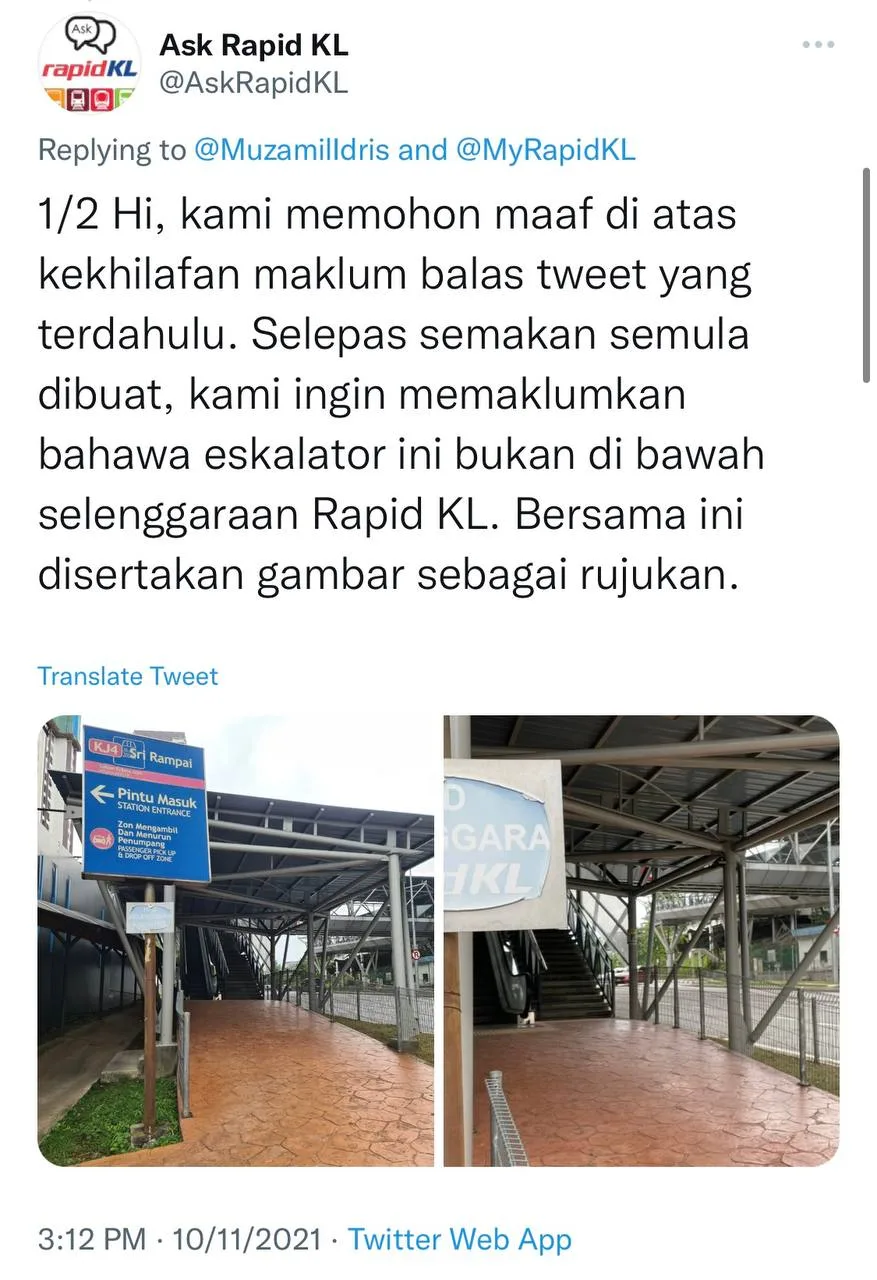 To which then, Rapid KL replied with their justification of the reason why the escalator hasn’t been fixed. They apologised but also denied their responsibility at the same time in a tweet that goes, “1/2 Hi, we are very sorry for our mistake regarding our previous tweet. After double checking, we would like to inform that this escalator isn’t under Rapid KL’s maintenance jurisdiction. Below we attach these pictures for your reference.“