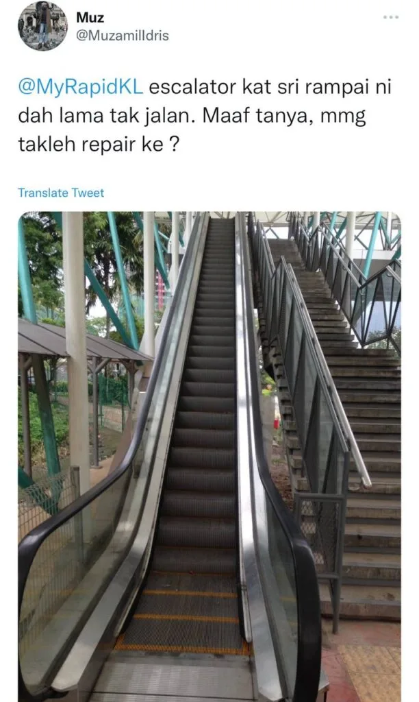 Muz, had once informed Rapid KL regarding the broken escalator issue — guess when? 5 years ago! He had posted a tweet on the 9th of November 2016, mentioning Rapid KL’s Twitter account, “It’s been awhile since the escalator here in Sri Rampai worked. I’m sorry for asking, but is it unrepairable?“, to which Rapid KL replied “Hi @MuzamilIdris we’re sorry for the inconvenience. As of now, we’re still waiting for the repair parts to fix the said escalator.“