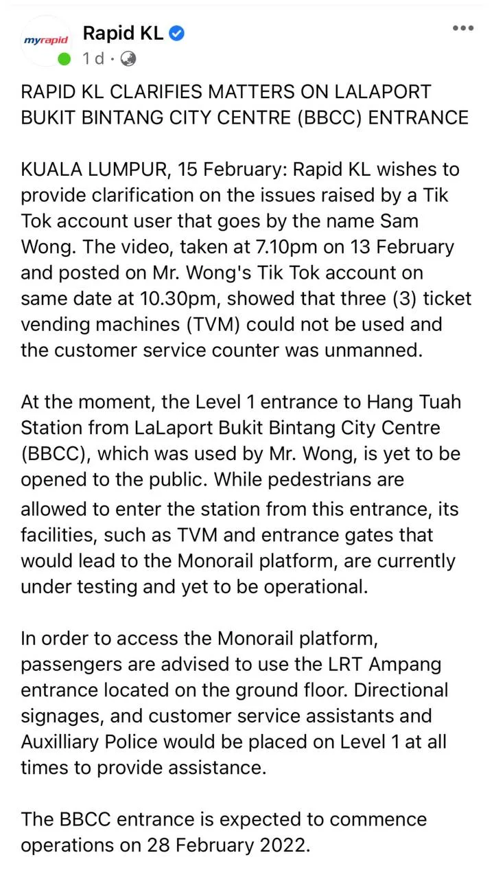 Since the TikTok video went viral, it has reached the authorities of Rapid KL – to which they responded with a public apology slash explanation regarding the situation on their official Facebook page. They explained that the station has yet to be opened to the public, and proceeded to suggest another route for the public to use as of now.