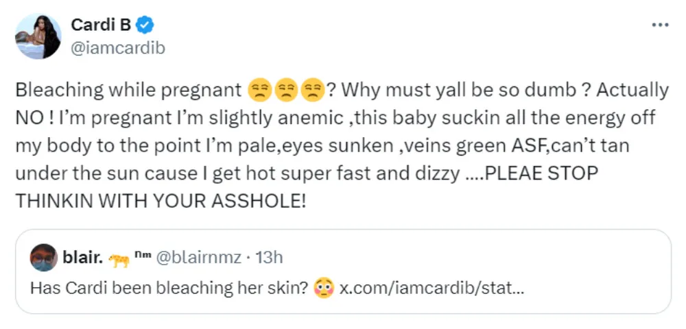 Unfortunately for that person, Cardi wouldn’t let the tweet slide. Instead, she slammed them for the accusation, arguing, “Bleaching while pregnant? Why must y’all be so dumb? Actually, NO! I’m pregnant, I’m slightly anaemic, this baby sucking all the energy off my body to the point I’m pale, eyes sunken, veins green ASF, can’t tan under the sun cause I get hot super fast and dizzy. PLEASE STOP THINKING WITH YOUR A**HOLE!”