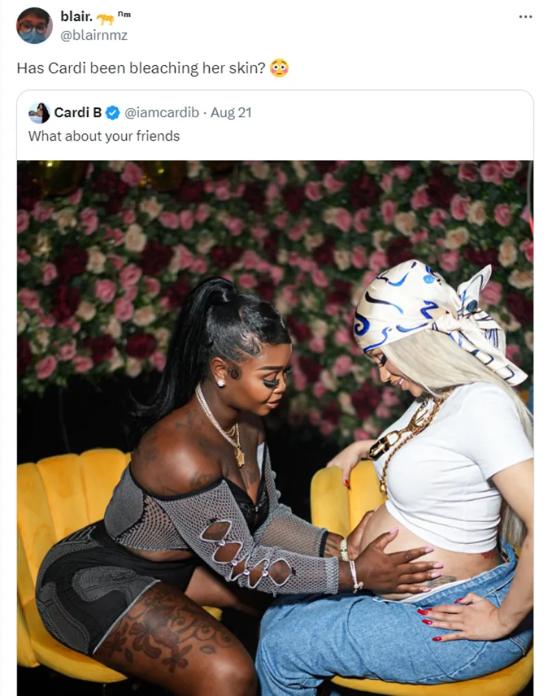 The rapper, who is currently expecting her third child despite having recently filed for divorce from rapper Offset, recently posted a photo of her with her friend, Star Brim. In the picture, Cardi wore a short-sleeved crop top, which showed off a lot of skin. However, her skin, particularly at the stomach and arm region, appears lighter than her usually darker skin colour, which led to someone questioning, “Has Cardi been bleaching her skin?”.