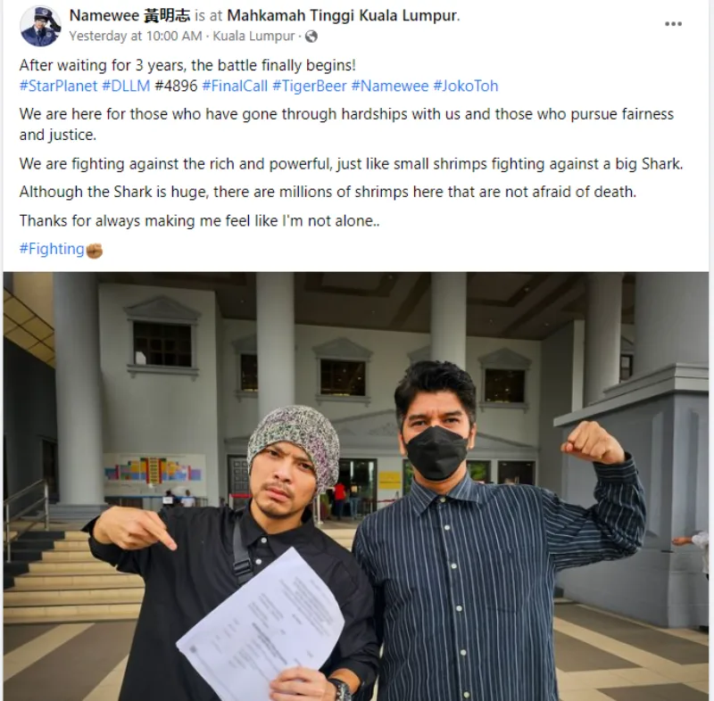 3 years after the incident, the local artist posted on Facebook yesterday (Tuesday, 5th September) to share his thoughts on the defamation trial which started on the same day at the Kuala Lumpur High Court. “We are here for those who have gone through hardships with us and those who pursue fairness and justice. We are fighting against the rich and powerful, just like small shrimps fighting against a big Shark,” he wrote.