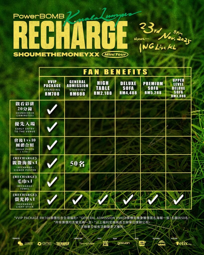 - Ticket Prices: VVIP Package (Standing): RM708, General Admission (Standing): RM608, High Table (4 pax): RM2,188, Deluxe Sofa (8 pax): RM4,488, Premium Sofa (10 pax): RM5,288, Upper Level Deluxe Sofa (8 pax): RM3,888