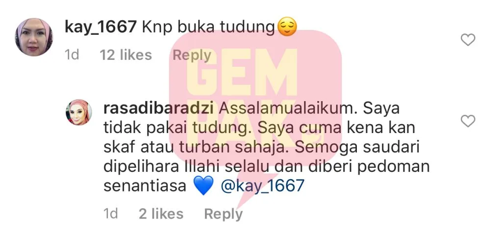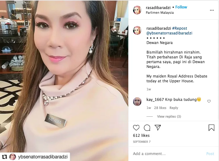 In her recent update on Instagram, Ras was pictured sans her hijab during a Dewan Negara meeting. One netizen named @kay_1667 took to the comments section and questioned, “Why did you take off your tudung? ?”