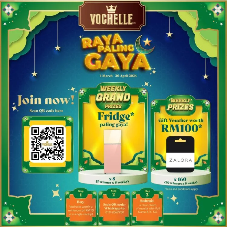 Vochelle invites you to take part in the most exciting event this season, the “Raya Paling Gaya” contest! From now until 30th April 2024, immerse yourself in indulgent chocolate creations and earn amazing prizes that are sure to brighten up your Raya celebrations. Here’s how you can enjoy your favourite treats and win big this Raya season: