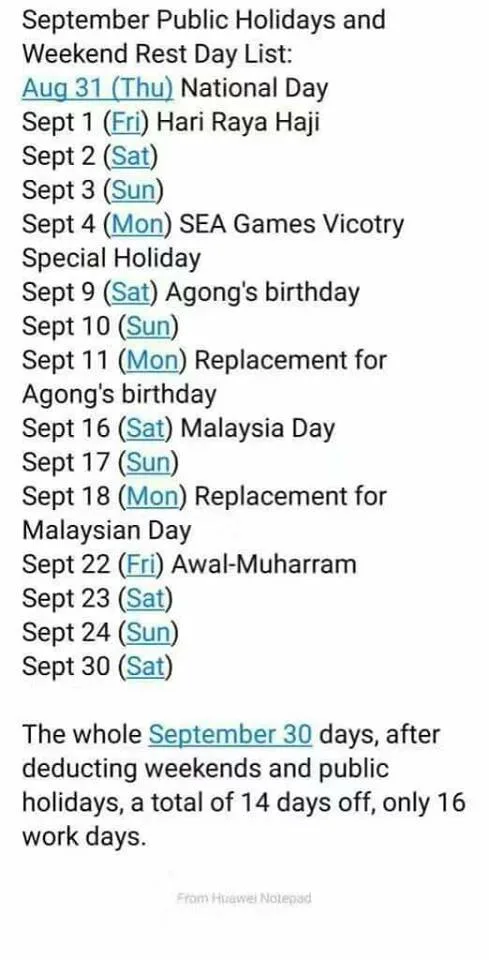 The above image, which states that there are more long weekends ahead for the month of September, has been heavily circulated on Facebook. According to its deduction, with a total of 14 days off for the month, there are only 16 work days. Unfortunately, it’s not entirely accurate, as it included replacement holidays that might not apply across-the-board.