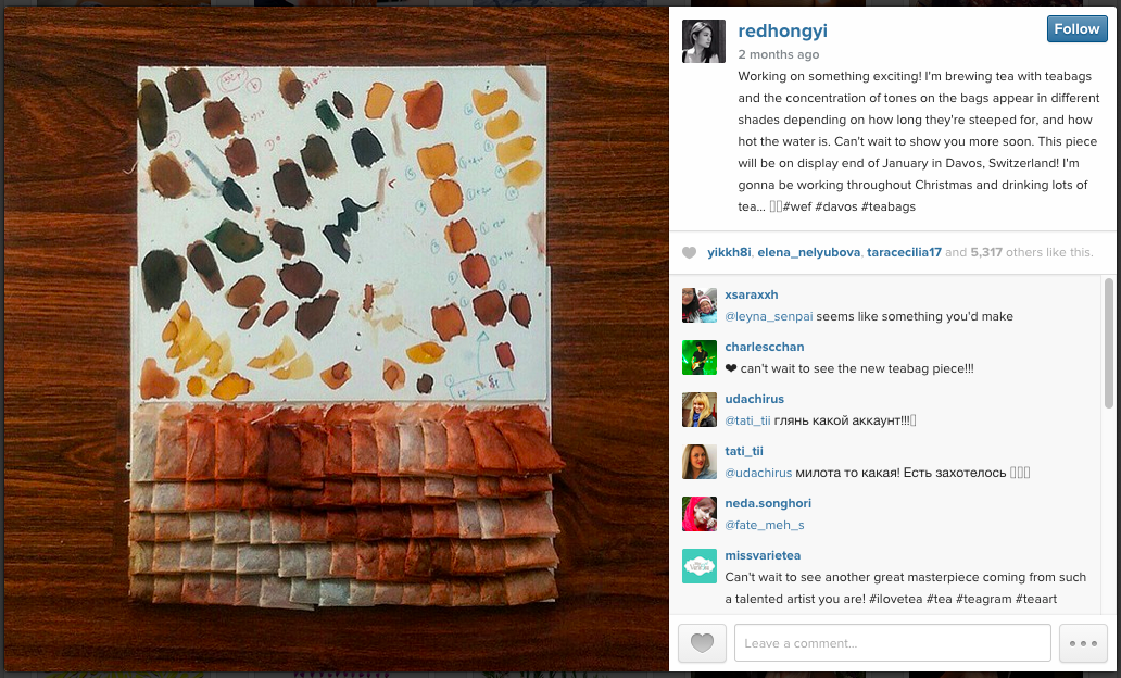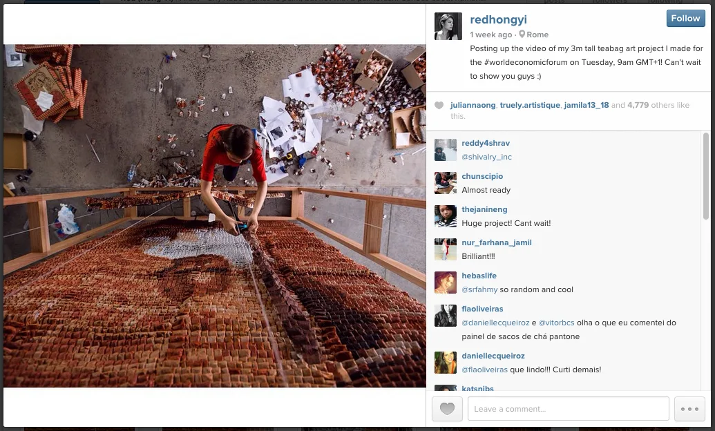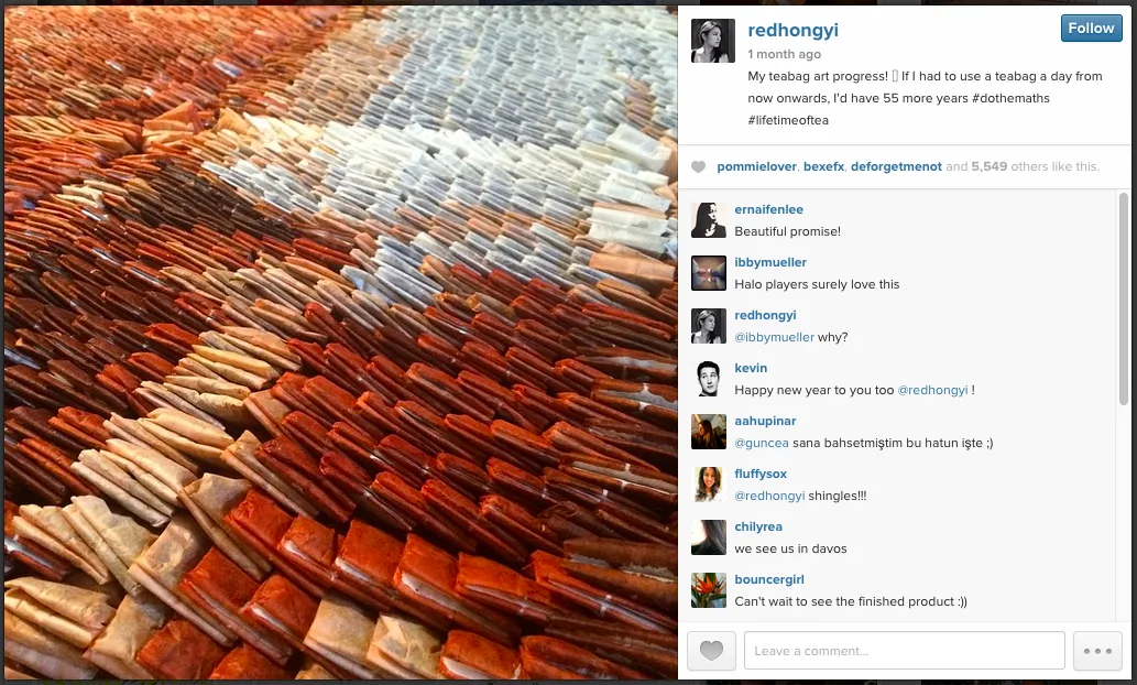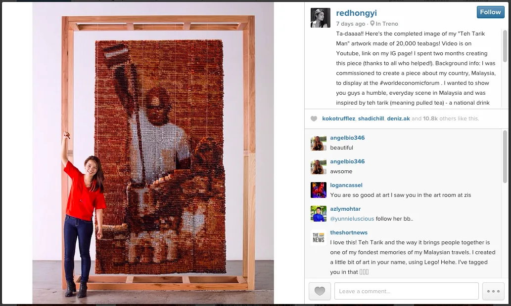 The installation was called, “Teh Tarik Man”, a 10-foot by 7-foot masterpiece which used 20,000 teabags, weighing more than 440 pounds. The process included needing to stain the teabags in 10 different shades of brown, a variation Red Hong Yi achieved by steeping them in an assortment of water temperatures for different amounts of time. She then added brown food dye for the darkest tones.