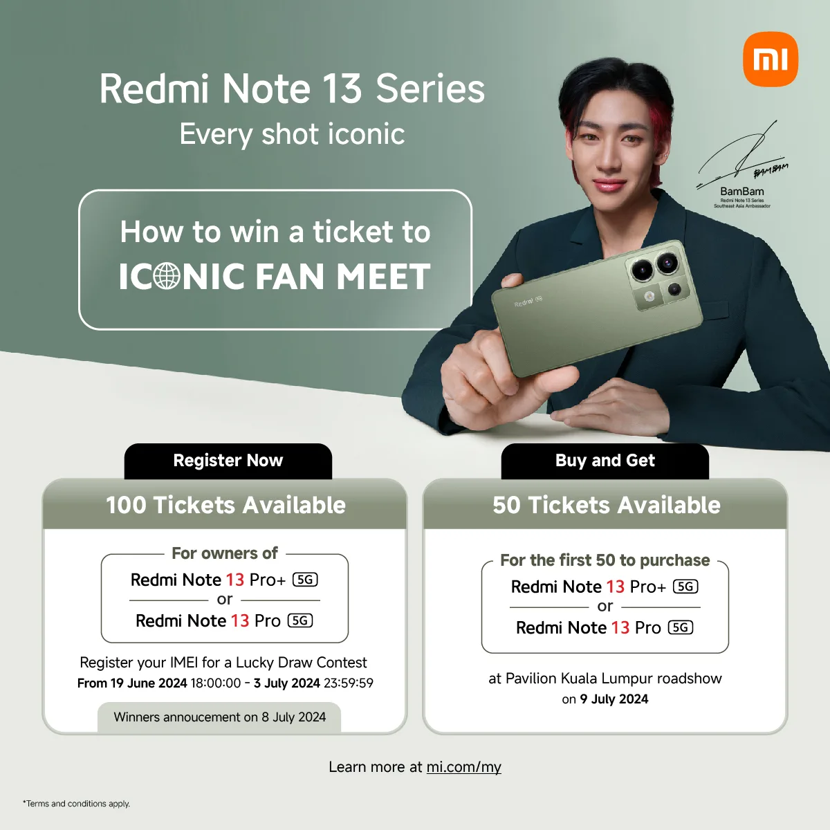 Good news for Redmi Note 13 Series users! Malaysian users of any Redmi Note 13 Pro+ 5G and Redmi Note 13 Pro 5G can stand a chance to win tickets to attend the ‘Iconic Fan Meet’ to see Redmi Note 13 Series’ Southeast Asia ambassador, BamBam. Event registration is happening now until 3rd July, 2024.