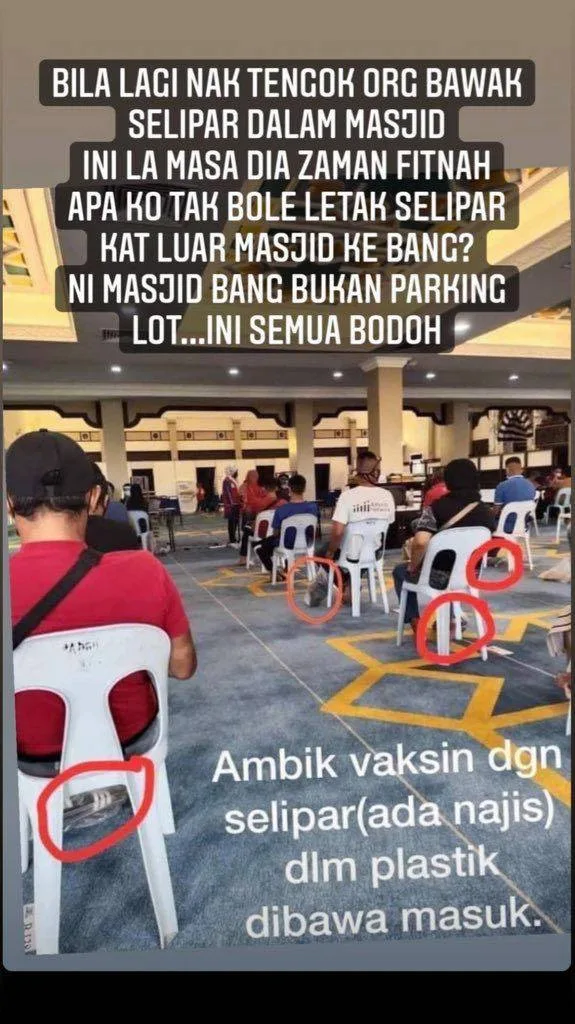 A photo showing a few individuals bringing their slippers inside a mosque in Sarawak while waiting for their turns to get vaccinated went viral on social media recently, much to the displeasure of local netizens.