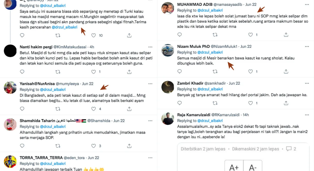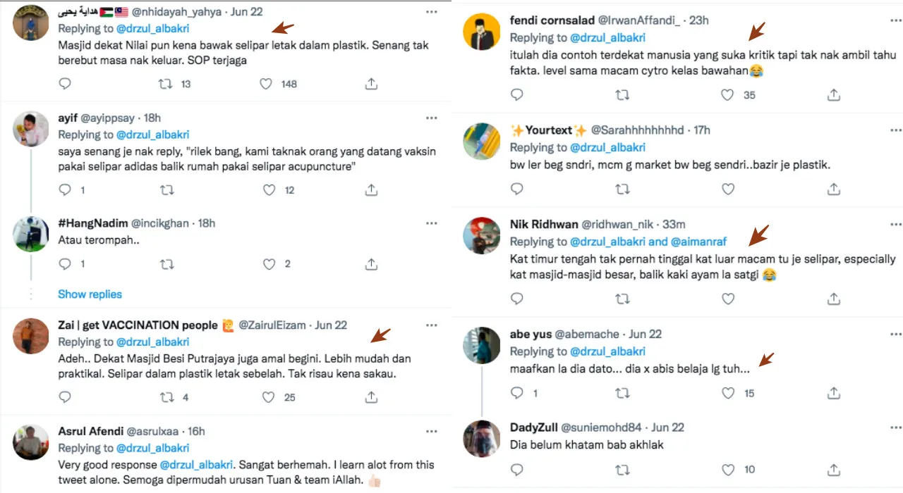 The female netizen’s statement had also prompted Dr. Zulkifli to issue his response in order to clear the air on the situation. “This picture was taken at the Darul Hana Mosque in Kuching, Sarawak. The slippers and shoes belonging to the vaccine receivers were put inside a plastic and were brought along into the mosque,” he wrote on his official Twitter account.