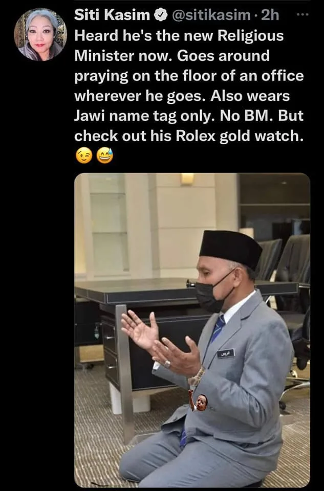 For those in the dark, the rumour started after legal practitioner Siti Kasim took to Twitter to hit out at Idris. She tweeted “Heard he’s the new religious minister now. Goes around praying on the floor of an office wherever he goes. Also wears Jawi name tag only. No BM. But check out his Rolex gold watch.”