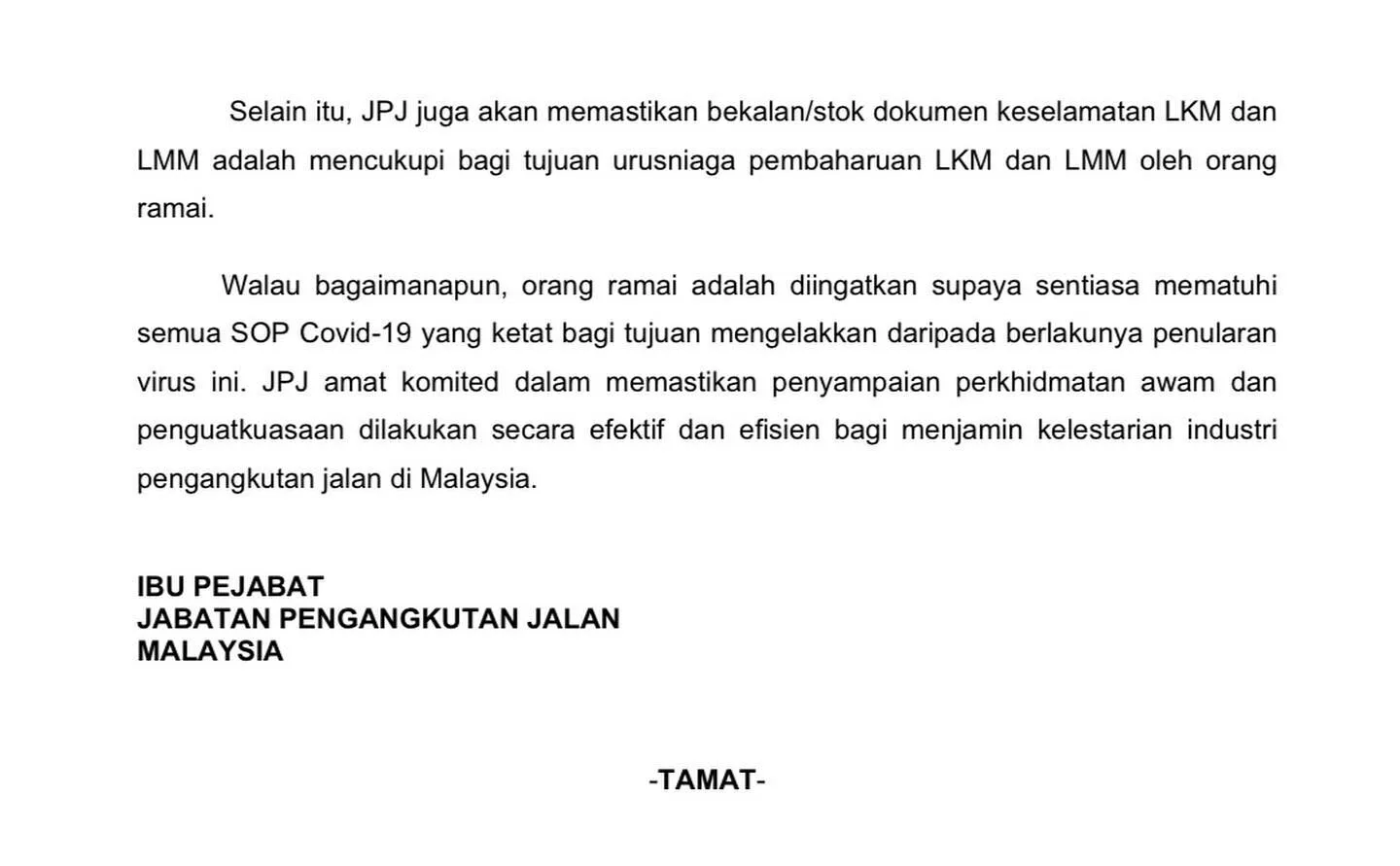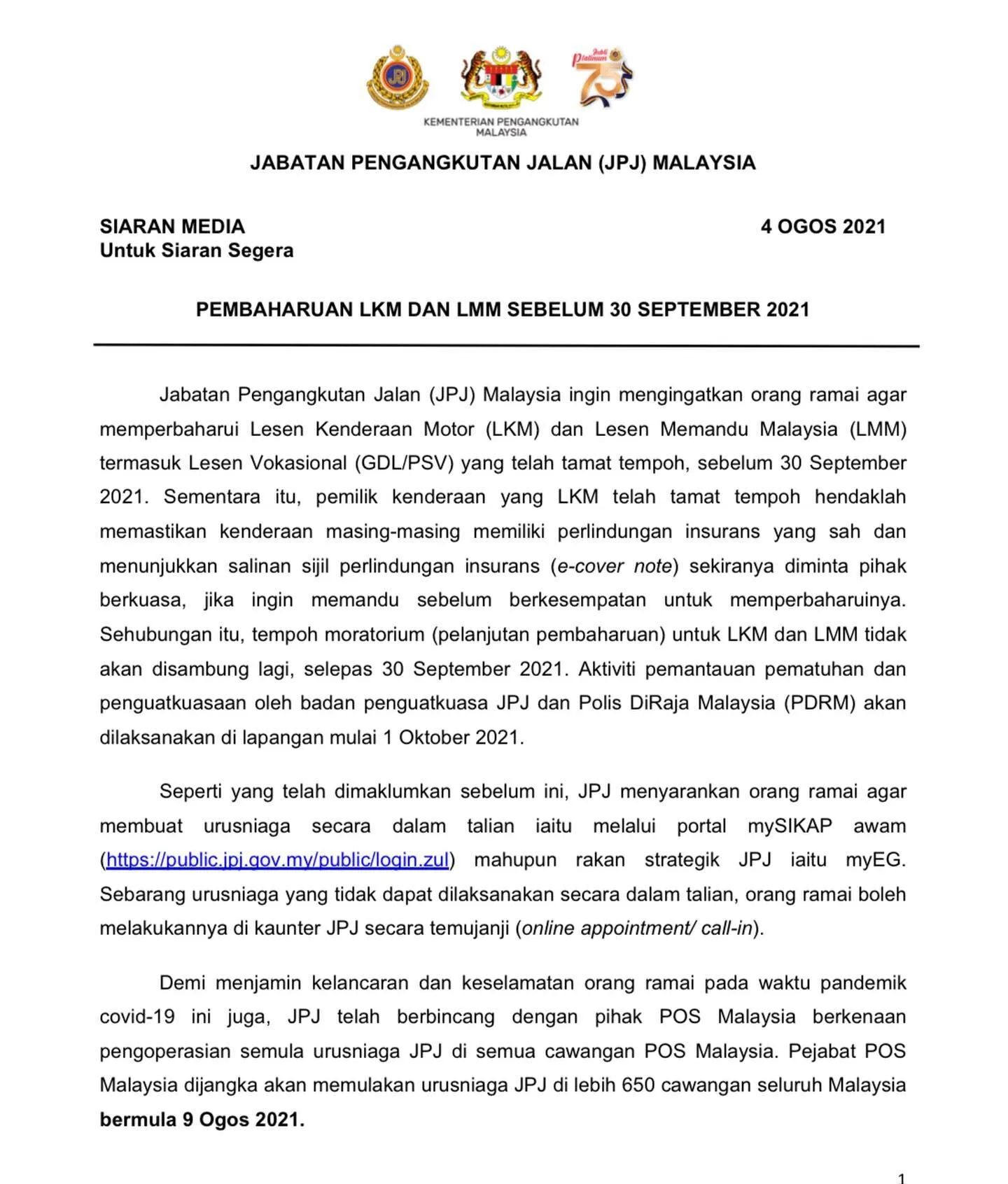 “The renewal of LMM and LKM could be carried out online via the MySikap portal, at JPJ counters nationwide post-receiving an appointment or through MyEG and POS Malaysia, beginning 9th August 2021. Officials and police officers will conduct checks on compliance and enforcement beginning 1st October 2021.”