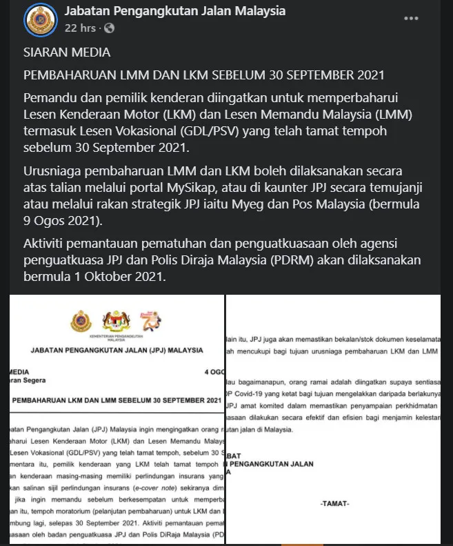 The caption of the Facebook post reads, “Drivers and owners of vehicles are reminded to renew their driver’s license that have been expired by 30th September 2021. These licenses include, the Competent Driving Licences (CDL), Motor Vehicle Licences (LKM or road tax), Goods Driving Licence (GDL), and the Public Service Vehicle (PSV) licence.”