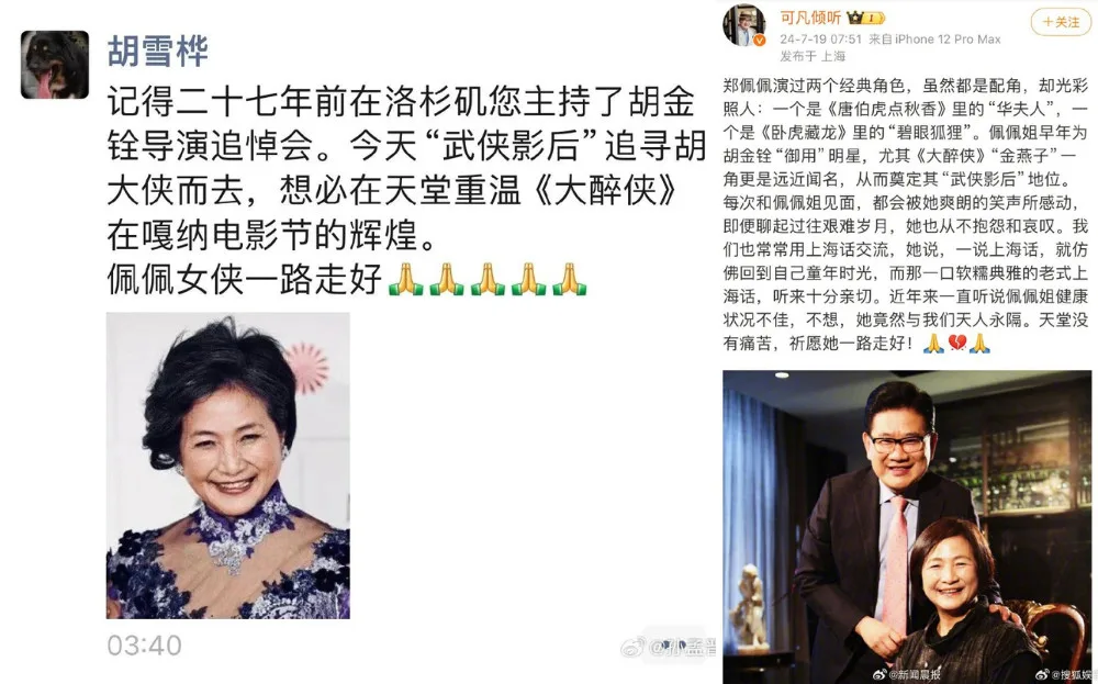 The devastating news was publicly shared by many of Pei Pei’s colleagues in the entertainment industry, including Chinese-American Sherwood Hu (胡雪桦). The filmmaker wrote through his WeChat Moments post, “I remember 27 years ago, in Los Angeles, you hosted a memorial service for director King Hu (胡金銓). Today, the “Kung Fu Queen” has gone to follow King Hu. I believe she’s reliving the glory of “Come Drink With Me (大醉侠)” at the Cannes Film Festival in heaven. Rest in peace, Queen Pei Pei.”
