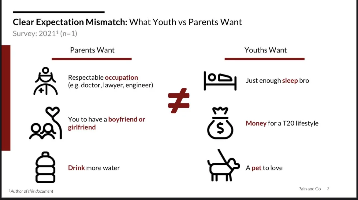 In his first slide, he presented what parents tend to expect from us, while comparing it to what the younger generation want. Asian parents are probably the best (read: kiasu) at comparing their children’s achievement with others as though it’s a competition. God forbid if you’re not in a respectable high-paying occupation. To add on to that, one is expected to have a qualified partner as well.