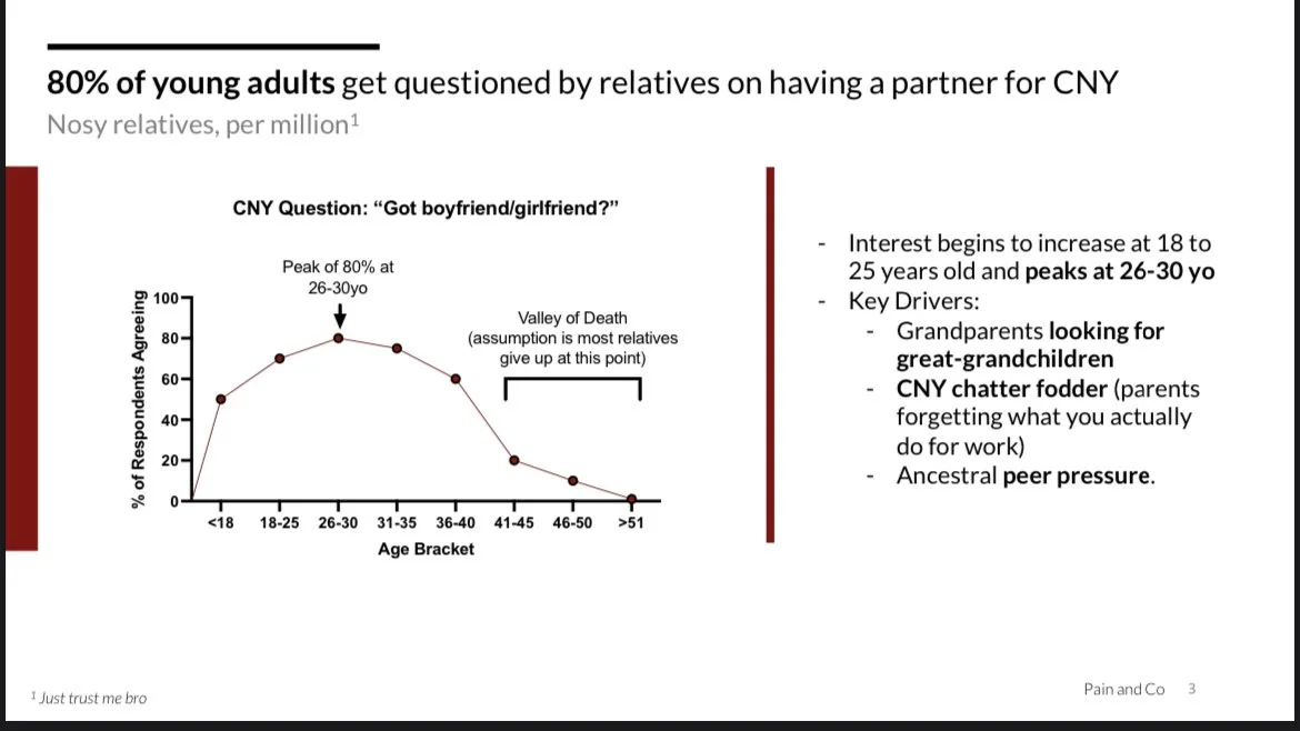 In his next slide, he stated that 80% of young adults are questioned by elders on having a partner during CNY, which he included a graph along with it on when does the question peak for most (usually 26 to 30 years old).