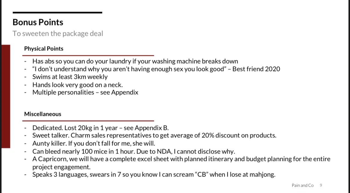 Recently, a Malaysian Twitter user named Arthur Yeow (@arthuryeow) decided to get real creative and created a set of slides that look like an actual business pitch. What’s he’s pitching? Himself! He even created a make-believe company, naming it Pain & Co. He stated that he made those slides out of “a massive explosion of chaotic energy.”