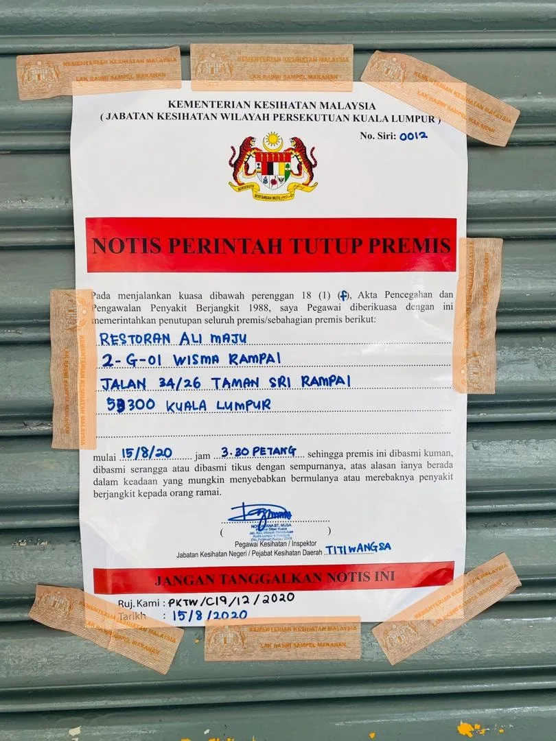 According to Oriental Daily, 2 employees who work at Restaurant Ali Maju have been suspected to have contracted Covid-19. As a result, the restaurant located at Sri Rampai has been issued a closure notice under the Prevention and Control of Infectious Diseases Act 1988. This is to allow the Federal Territory Health Department to carry out a thorough sanitisation process.
