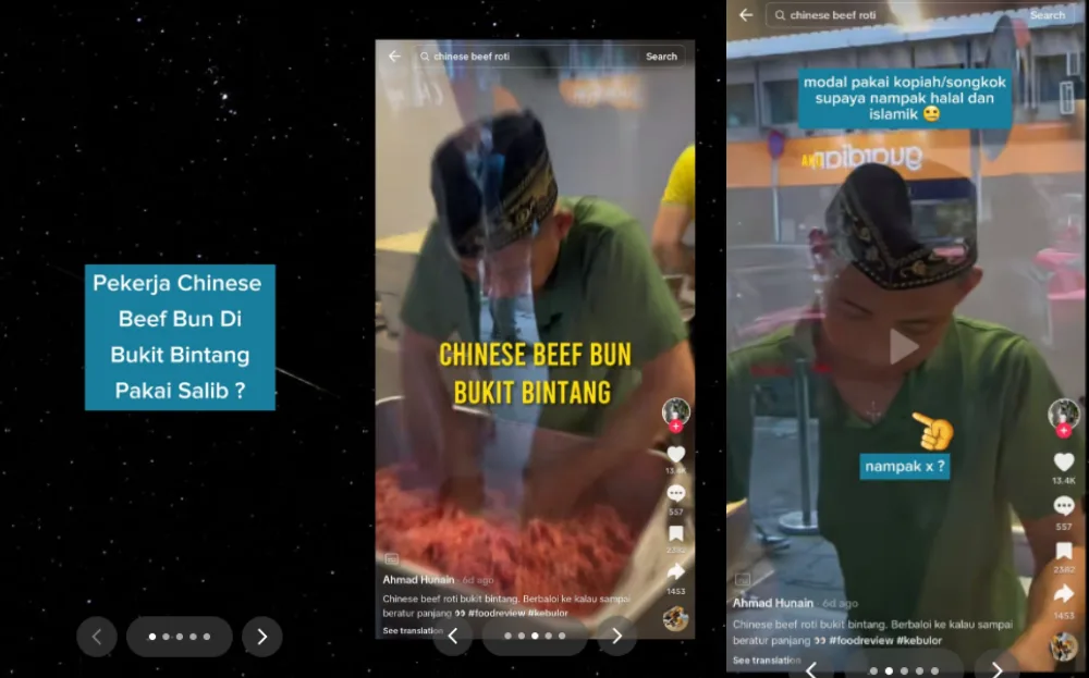 On 18th November, footage of the Muslim-friendly, Mon Chinese Beef Roti Restaurant at Bukit Bintang went viral, but not for good reasons. The group of photos uploaded to TikTok highlighted a worker they had spotted who was wearing a songkok and a necklace of a cross. “(The model) wears a songkok to look halal and Islamic,” they claimed, while pointing out the cross hidden under his shirt.