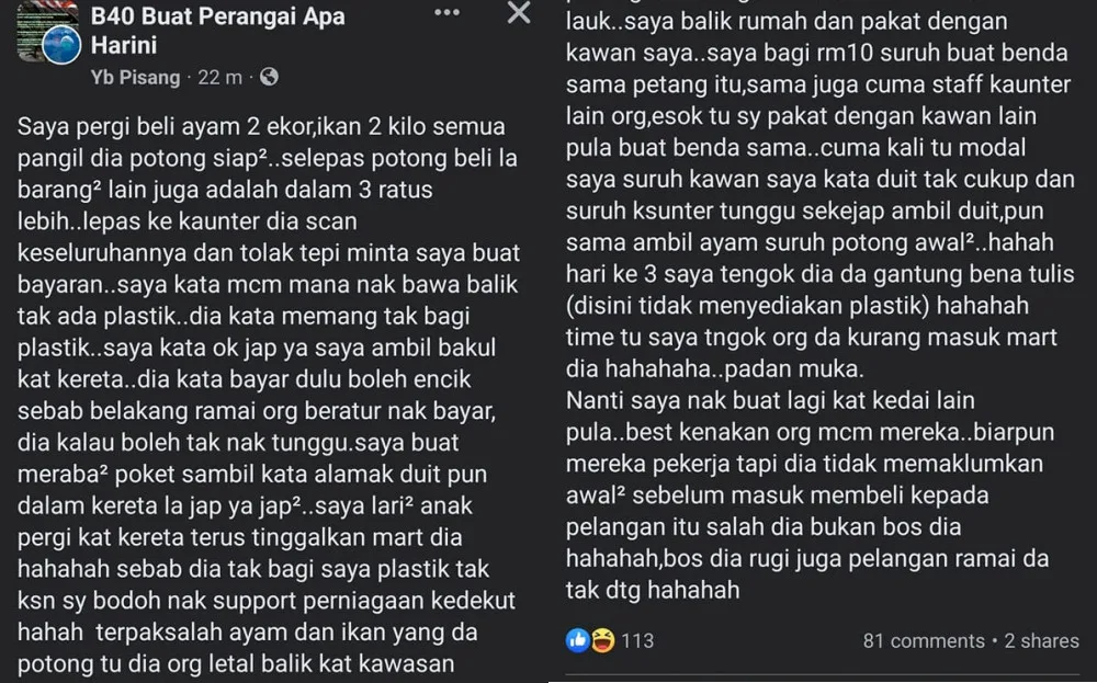 The netizen shared their antics on the “B40 Buat Perangai Apa Harini” Facebook group. Apparently, they’d bought 2 chickens and 2 kilograms of fish which had already been chopped up, in addition to other items that they’d needed. However, the shopping trip went awry the second they realised they would not be given a bag for their items.