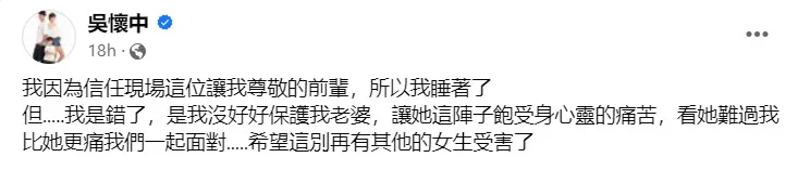 Her husband, Rex Wu too was upset when he discovered what had happened. “I (let my guard down) because I trusted the senior I respected at the scene,” he said in a Facebook post of his own. “But I was wrong. I didn’t protect my wife well, (and) she suffered physically and mentally for a while.”