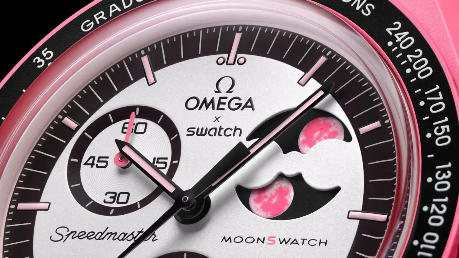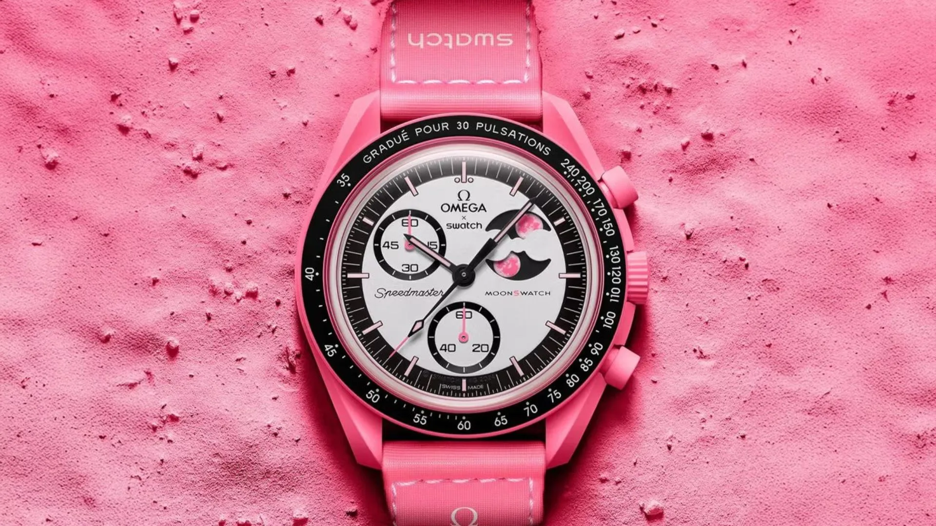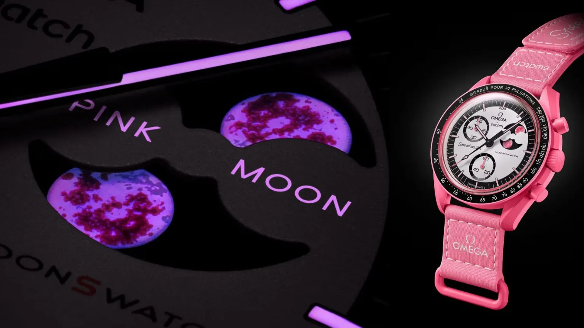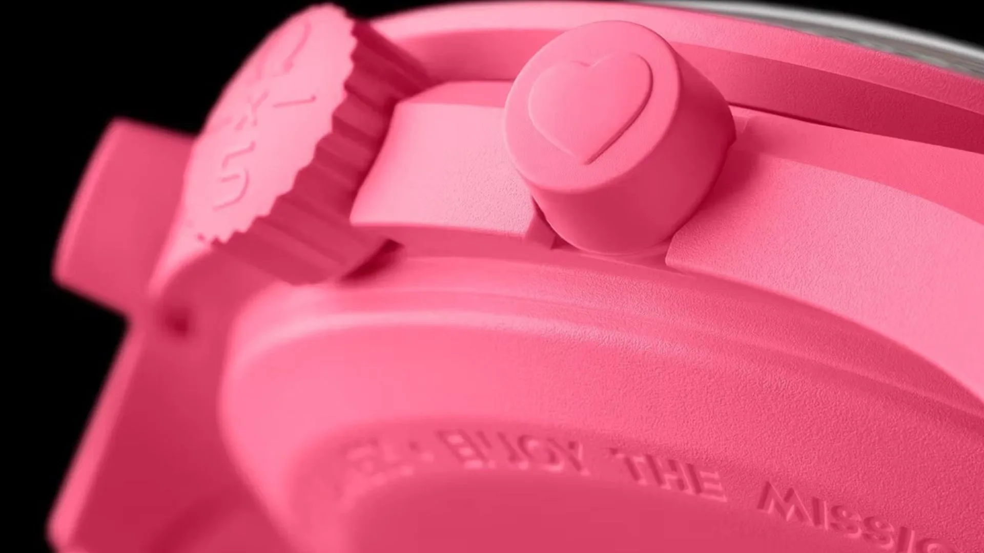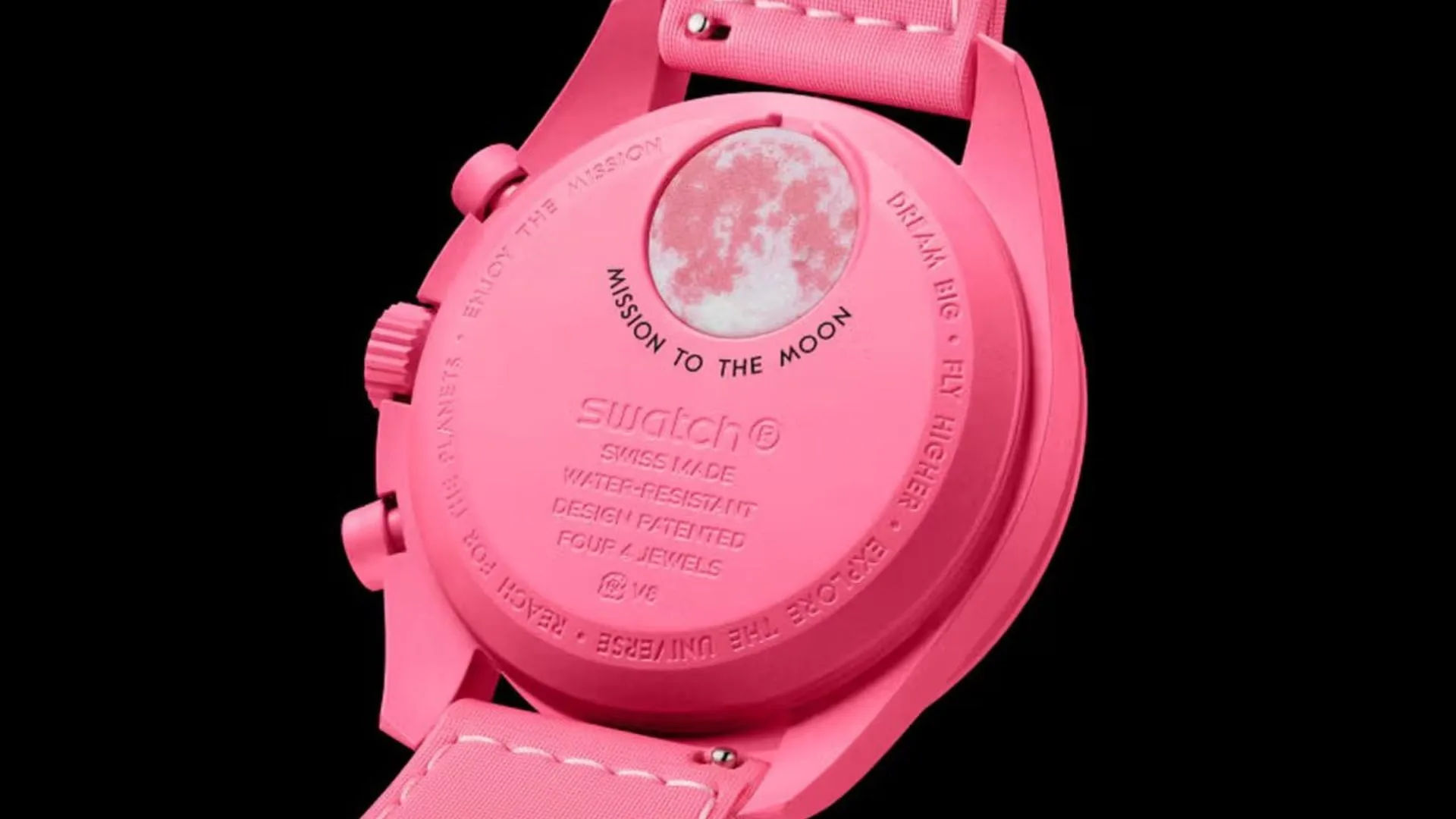 The OMEGA x Swatch branding, Speedmaster, and MoonSwatch logos unify the watch’s identity within the collection, while the caseback’s gorgeous display of pink hues further accentuates the cosmic theme.