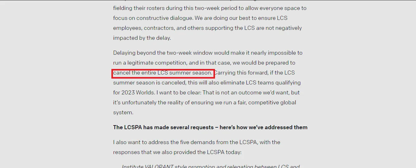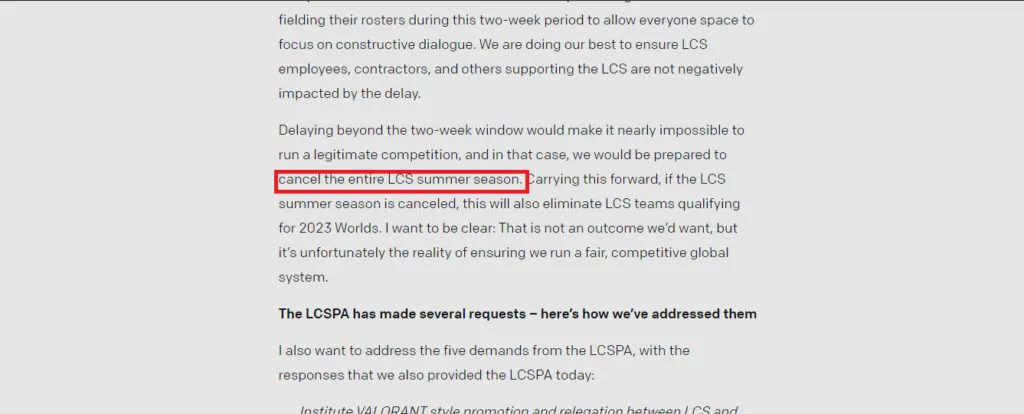 The LCSPA has gone on Twitter and other social media outlets, informing the people that they should refuse any offers given to them to be a part of the LCS team as it would greatly insult those players who have walked out and greatly undermine their entire struggle. With no players to field, Riot should be feeling the pinch, but instead, they gave an ultimatum in a lengthy article published on their official website: field a team within two weeks or the entire LCS summer season would be cancelled, automatically disqualifying them from World 2023.