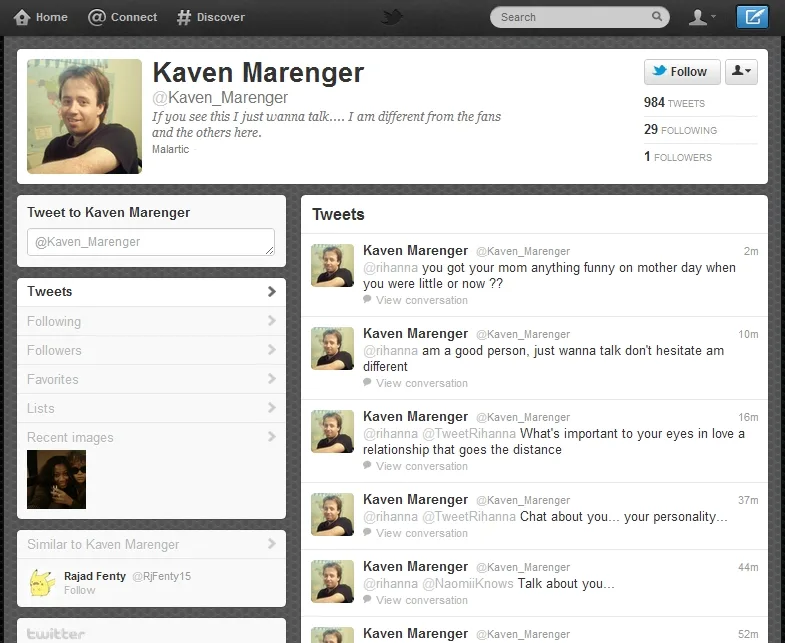 What started slow and “fanboy”-like soon turned desperate and creepy. And you would think that someone would stop if he still hasn’t gotten a reply after almost a thousand tweets – nope! Not Kaven. Besides, we’re pretty sure Rihanna checks her tweets.