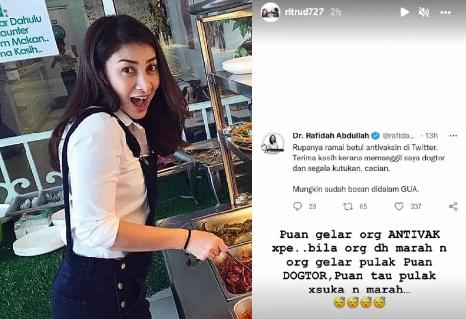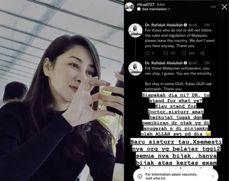 As if her previous statement wasn’t enough, the “Kutub Utara Kutub Selatan” actress came up with another post on her Instagram to put Dr. Rafidah on blast. She wrote, “It’s okay for you to call people anti-vaxxers. But when people got angry and called you ‘dogtor’, you got triggered in return” along with a series of sleeping emojis.