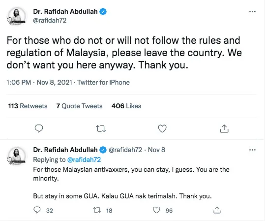 “For those Malaysian anti-vaxxers, you can stay, I guess. You are the minority,” Dr. Rafidah added in another thread on Twitter. “But [you can] stay in some gua (cave). That is, if the cave wants to welcome you guys in. Thank you.”