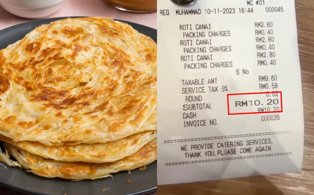 However, surprising her – and netizens – was the fact that her small order cost her a total of RM10.20. According to the receipt, each piece of roti canai cost RM2.80 and included a packing charge of RM0.40 per piece plus a 6% service tax.