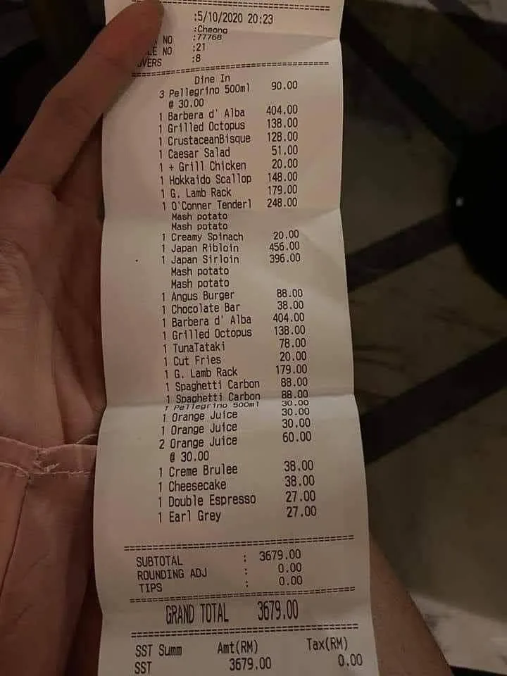 While Carmay’s friends ordered some of the most expensive food on the menu, her male acquaintance only ordered a burger that cost RM88 and a glass of water. The total bill that evening came up to RM3679. It was divided among 8 people, which rounded up to RM460 per person.