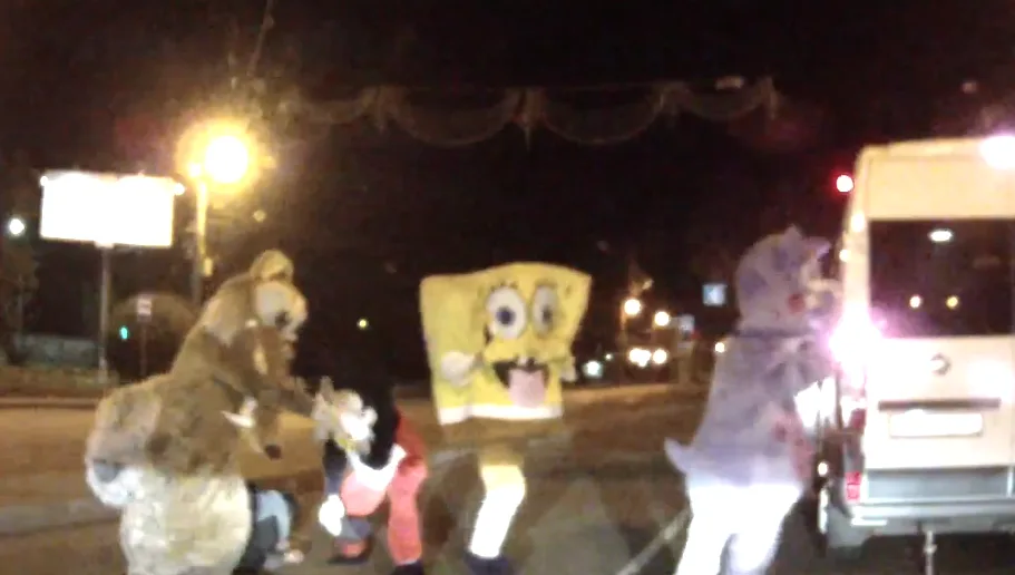 Then, suddenly, 4 “familiar” figures are seeing running out of the minivan to charge at the panel van driver. The mascots beat and kick him to the ground before fleeing the scene into their minivan, leaving the panel van driver on the ground and in agony.