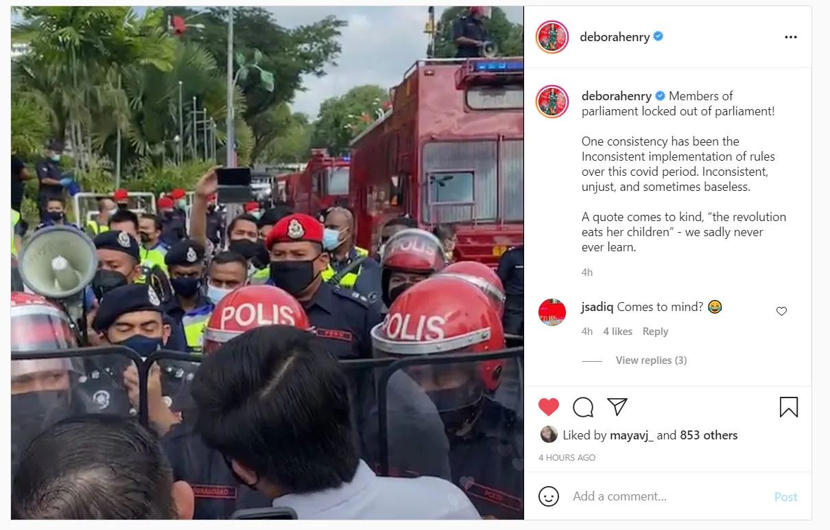 Miss Universe Malaysia 2011, Deborah Priya Henry posted on Instagram regarding the happenings of today. Her caption reads, “Members of parliament locked out of parliament! One consistency has been the inconsistent implementation of rules over this covid period. Inconsistent, unjust, and sometimes baseless. A quote comes to kind, “the revolution eats her children” – we sadly never ever learn.”