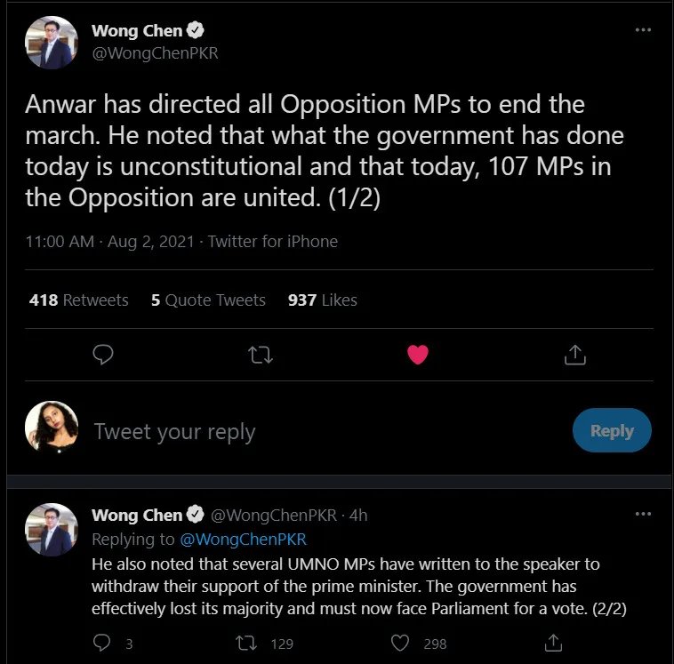 Adding on, he claimed that 107 opposition MPs are united and several UMNO MPs have written to the speaker to withdraw their support for the prime minister. This leads to the inevitable fact that the government has lost its majority and must face parliament for a vote!