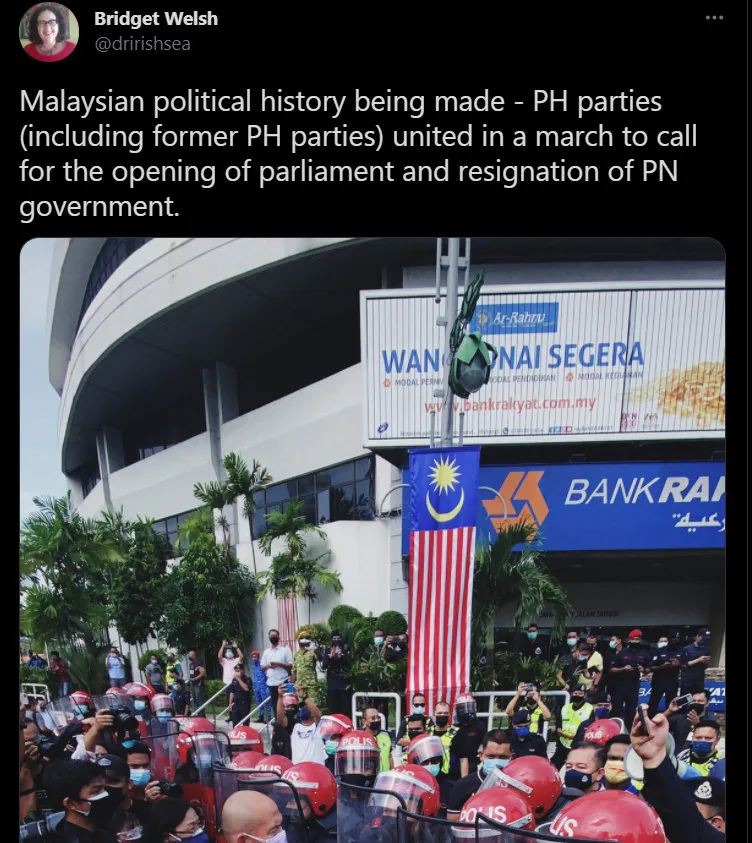 This truly adds to another historic moment that our country has achieved in the past decade. Political analyst, Bridget Welsh posted, “Malaysian political history being made – PH parties (including former PH parties) united in a march to call for the opening of parliament and resignation of PN government.”