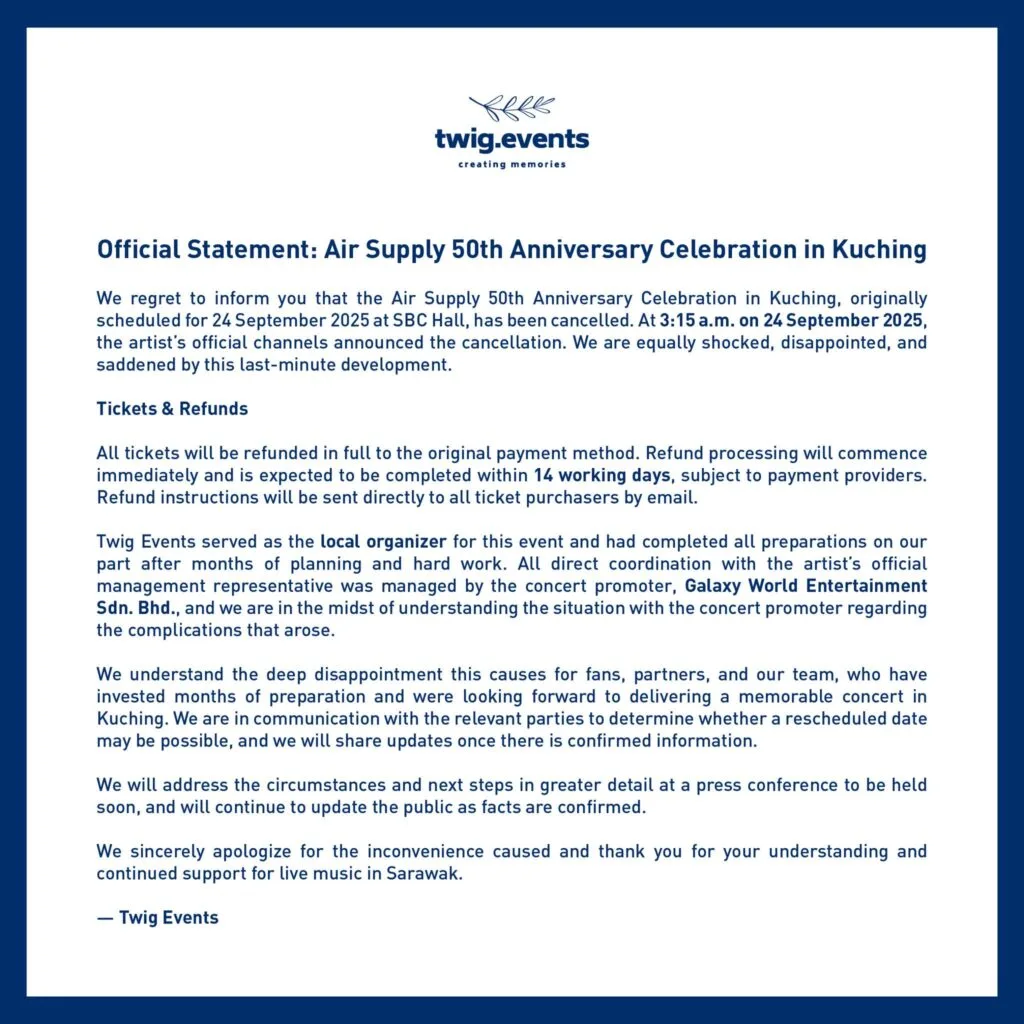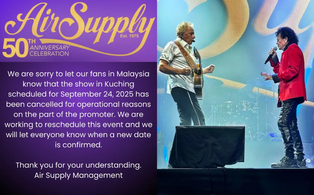 The Australian rock duo was scheduled to perform their 50th Anniversary Celebration concert at SBC Hall in Kuching, Sarawak, on 24th September 2025 (Wednesday). However, on the morning of the concert, Air Supply announced through social media that the concert was cancelled due to operational reasons on the part of the promoter. The band apologised for the matter and said they’re looking to reschedule the concert.
