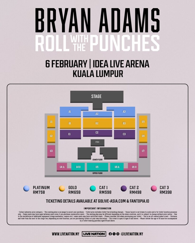 With over four decades of hits, Bryan Adams’ music has defined generations, transcended borders, and connected millions of fans worldwide. Now, Malaysian audiences will get the chance to experience his legendary showmanship and raw passion on stage. His concert takes place on 6th February 2026 (Friday) at Idea Live Arena. Tickets to the show will be available from 14th October 2025 (Tuesday) onwards.