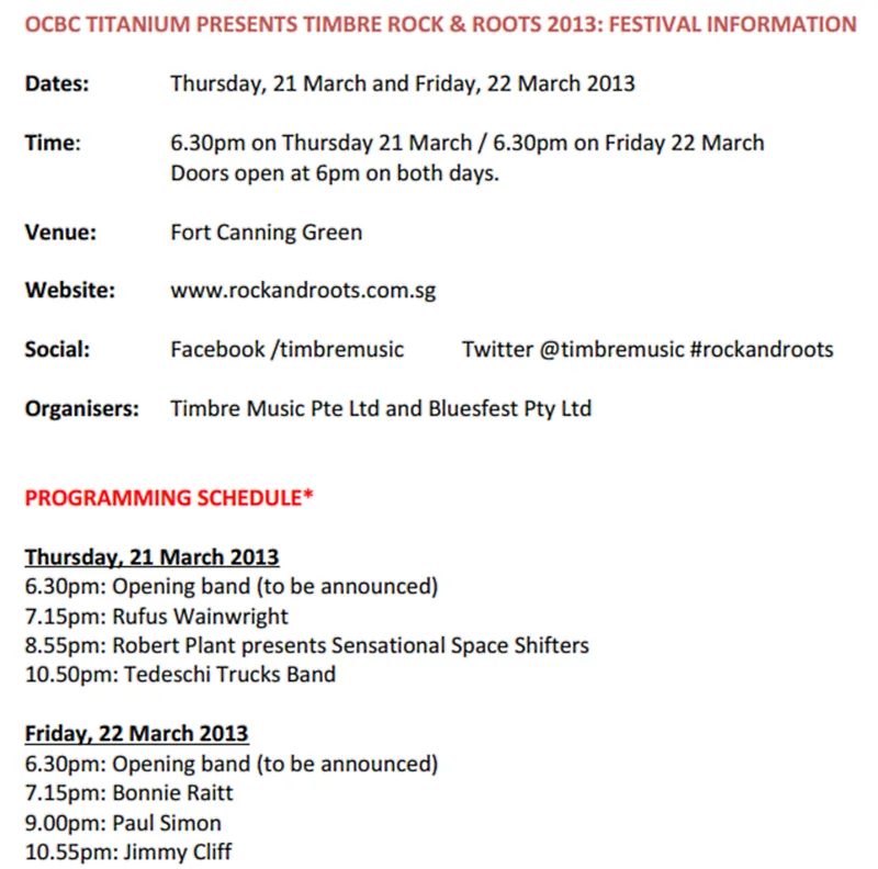 Organized by homegrown concert organizers and F&B chain, Timbre, “Rock & Roots” is a spin-off from Australian music festival, “Byron Bay Bluesfest”. Presented by OCBC Titanium, the event will feature its biggest and best lineup yet for the festival’s fourth year, slated to happen on 21st and 22nd March 2013 (Thursday and Friday) at Fort Canning Green, Singapore.