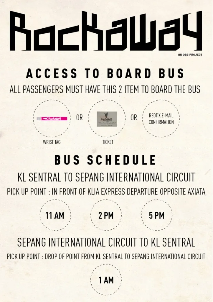 Addressing the issues of transportation to the venue, Livescape Asia also revealed that there will be FREE shuttle busses for Rockaway Festival ticket holders that will take them from KL Sentral to Sepang International Circuit and vice versa. These shuttle busses will begin their route at 11am on festival day.